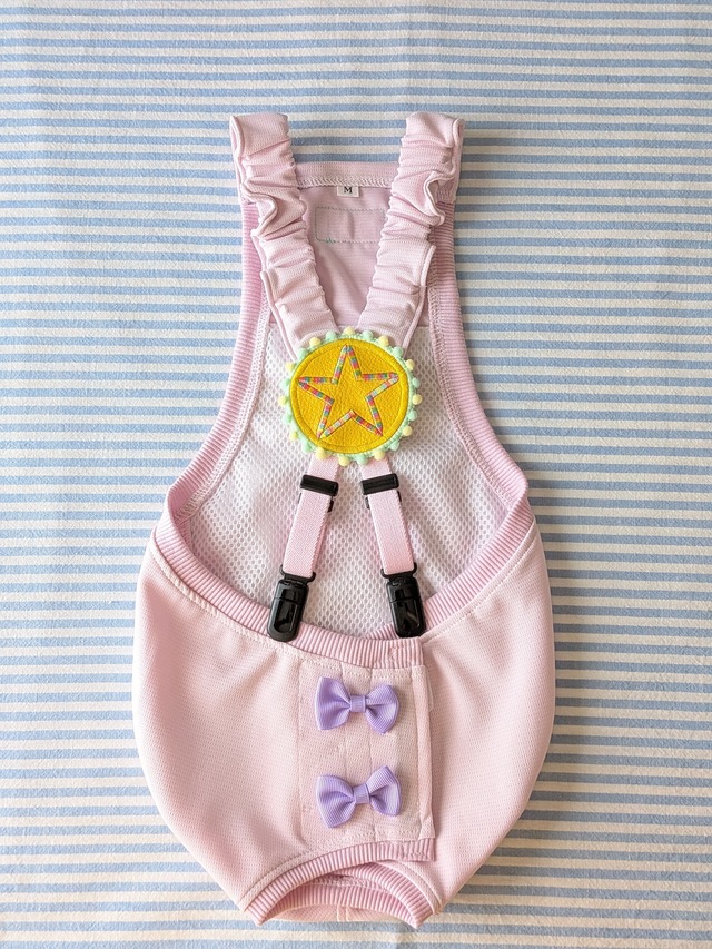 色々な事情でオムツをしなければいけない子を可哀想ではなく! かわいく過ごしてほしくて作りました♪ その名も☆金メダルサスペンダー☆ 使っている子もその子に着けるご家族にも金メダルの意味を込めて(*´▽`*) ケアが必要になる前に、洋服感覚でマナーウェアのアイテムとしてご利用いただくことで、ケア期の始まりをストレスフリーに過ごせます。 もちろんマナーベルトにもご使用いただけます。 ☆男の子女の子兼用 首回りは、身体への負担を軽減するため平ゴムをコットン生地(テリークロスやダブルガーゼなど)で包んで伸縮性を持たせました。 顔回りの輪っかのところは、実際の首回り+5~7センチ前後でご検討いただけますとしっくりくるかと思います。 【出来上がりサイズ】 SSサイズ(体長:23~27cm位)☆NEWサイズ 顔回り輪っか:32~40㎝ お腹クリップから金メダル手前10.5~15㎝ 背中のクリップから背カン手前9.5~13㎝ ※お腹側&背中側の伸縮ゴムの幅1.5㎝ Sサイズ(体長:25~27cm位) 顔回り輪っか:35~45㎝ お腹クリップから金メダル手前9.5~13㎝ 背中のクリップから背カン手前9~12㎝ ※お腹側&背中側の伸縮ゴムの幅1.5㎝ 参考≫パグ♀5.5㎏・首29cm・体長27cm SLサイズ(体長:27~35cm位) 顔回り輪っか:35~45㎝ お腹クリップから金メダル手前11~16㎝ 背中のクリップから背カン手前10.5~14.5㎝ ※お腹側&背中側の伸縮ゴムの幅1.5㎝ ※MLサイズをお使いで首回りがゆるい子におススメです。 Mサイズ(体長:27~33cm位) 顔回りの輪っか:38~48㎝ お腹クリップから金メダル手前9.5~13㎝ 背中のクリップから背カン手前9~12㎝ ※お腹側&背中側の伸縮ゴムの幅1.5㎝ MLサイズ(体長:27~35cm位) 顔回りの輪っか:38~48㎝ お腹クリップから金メダル手前10~14㎝ 背中のクリップから背カン手前9.5~13.5㎝ ※お腹側&背中側の伸縮ゴムの幅1.5㎝ 参考≫パグ♀8.5㎏・首35㎝・体長33㎝ 参考≫フレブル♀9㎏・首35cm・体長37cm 参考≫フレブル♂10.5㎏・首39cm・体長27cm Lサイズ(体長:30~40cm位) 顔周りの輪っか:44~58㎝ お腹クリップから金メダル手前11~16㎝ 背中のクリップから背カン手前10.5~14.5㎝ ※お腹側&背中側の伸縮ゴムの幅2㎝ LLサイズ(体長:30~40cm位) 顔周りの輪っか:44~58㎝ お腹クリップから金メダル手前12~18㎝ 背中のクリップから背カン手前11.5~16.5㎝ ※お腹側&背中側の伸縮ゴムの幅2㎝ 参考≫フレブル♀9㎏・首32㎝・体長31㎝ (肌が弱いためお洋服の上から、緩めに使用中) 参考≫フレブル♀15㎏・首42㎝・体長35㎝ Bsサイズ(体長35~50㎝位) 顔周りの輪っか:56~66㎝ お腹クリップから金メダル手前18~29㎝ 背中のクリップから背カン手前14~21㎝ ※お腹側の伸縮ゴムの幅3㎝&背中側の伸縮ゴムの幅2.5㎝または3㎝ ※平均的なブルドッグさんの大きさでしたら、こちらで大丈夫かと思います。 参考≫ブルドッグ♀26㎏・首49㎝・体長40㎝ ※GレトリバーさんはBL/Gサイズをご覧ください。 Bサイズ(体長35~50㎝位) 顔周りの輪っか:56~66㎝ お腹クリップから金メダル手前21.5~36㎝ 背中のクリップから背カン手前14~21㎝ ※お腹側の伸縮ゴムの幅3㎝&背中側の伸縮ゴムの幅2.5㎝ 参考≫ブルドッグ♀26㎏・首49㎝・体長40cm BL/Gサイズ(体長35~50㎝位) 顔周りの輪っか:56~66㎝ お腹クリップから金メダル手前20.5~34㎝ 背中のクリップから背カン手前19~30.5㎝ ※お腹側の伸縮ゴムの幅3㎝&背中側の伸縮ゴムの幅2.5㎝ ※背中側のゴムの長さがB(ブルドッグ)サイズよりも10㎝ほど長くなっています。 SSSサイズ (体長:18~23cm位) 顔回り輪っか:27~35㎝くらい お腹クリップから金メダル手前9.5~13㎝くらい 背中のクリップから背カン手前7.5~9.5㎝ ※お腹側&背中側の伸縮ゴムの幅1.5㎝ 【ご注意】 ※輪っかになっている部分を顔周りを通す設計になっているので、顔周りの大きさのご確認もお願いいたします。 ※目安としてサイズの後ろに、体長を記載してありますが、体型によって多少異なりますので、ご不安な場合はご相談ください。 ※ひとつずつ手作りしておりますので、多少の誤差が出てしまいます。あらかじめ、ご了承くださいませ。 ※オムツの種類によって使用サイズが変わる場合があります。犬用のオムツや人間用のパンツタイプの方が、腰深になりますので、ゴムが長い場合はアジャスターで調整を。それでも、長い場合は、腰回りを折ってクリップを挟んでご利用ください。 ※お洗濯は手洗いまたはクリップを閉じた状態でネットにいれて洗濯機をご利用ください。 ※お洗濯をしますと、長さの調整できる側のゴムが多少縮みます。