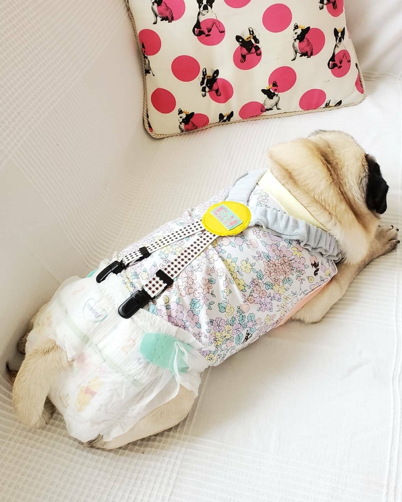 ※オムツの種類によって使用サイズが変わる場合があります。犬用のオムツや人間用のパンツタイプの方が、腰深になりますので、ゴムが長い場合はアジャスターで調整を。それでも、長い場合は、腰回りを折ってクリップを挟んでご利用ください。