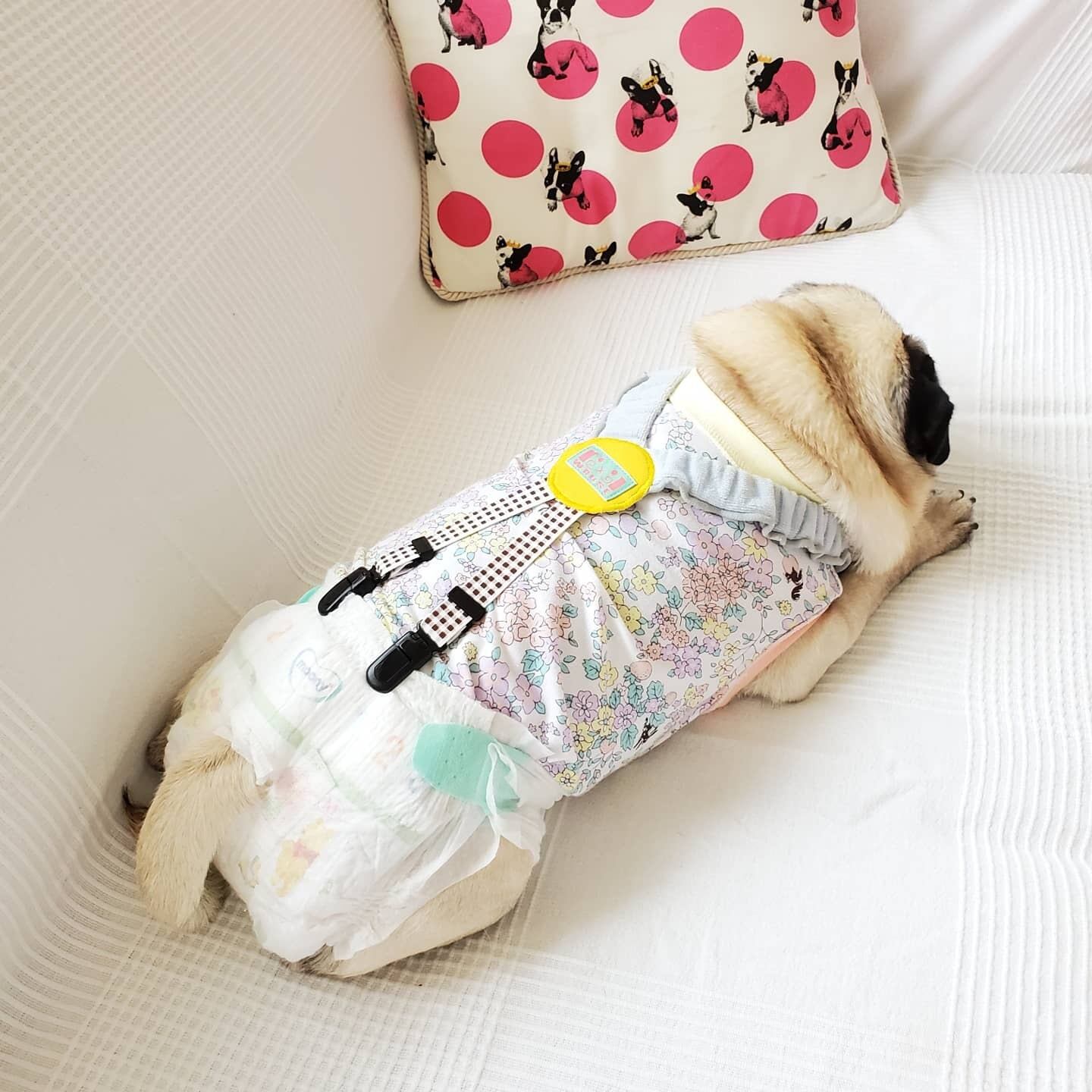 ※オムツの種類によって使用サイズが変わる場合があります。犬用のオムツや人間用のパンツタイプの方が、腰深になりますので、ゴムが長い場合はアジャスターで調整を。それでも、長い場合は、腰回りを折ってクリップを挟んでご利用ください。