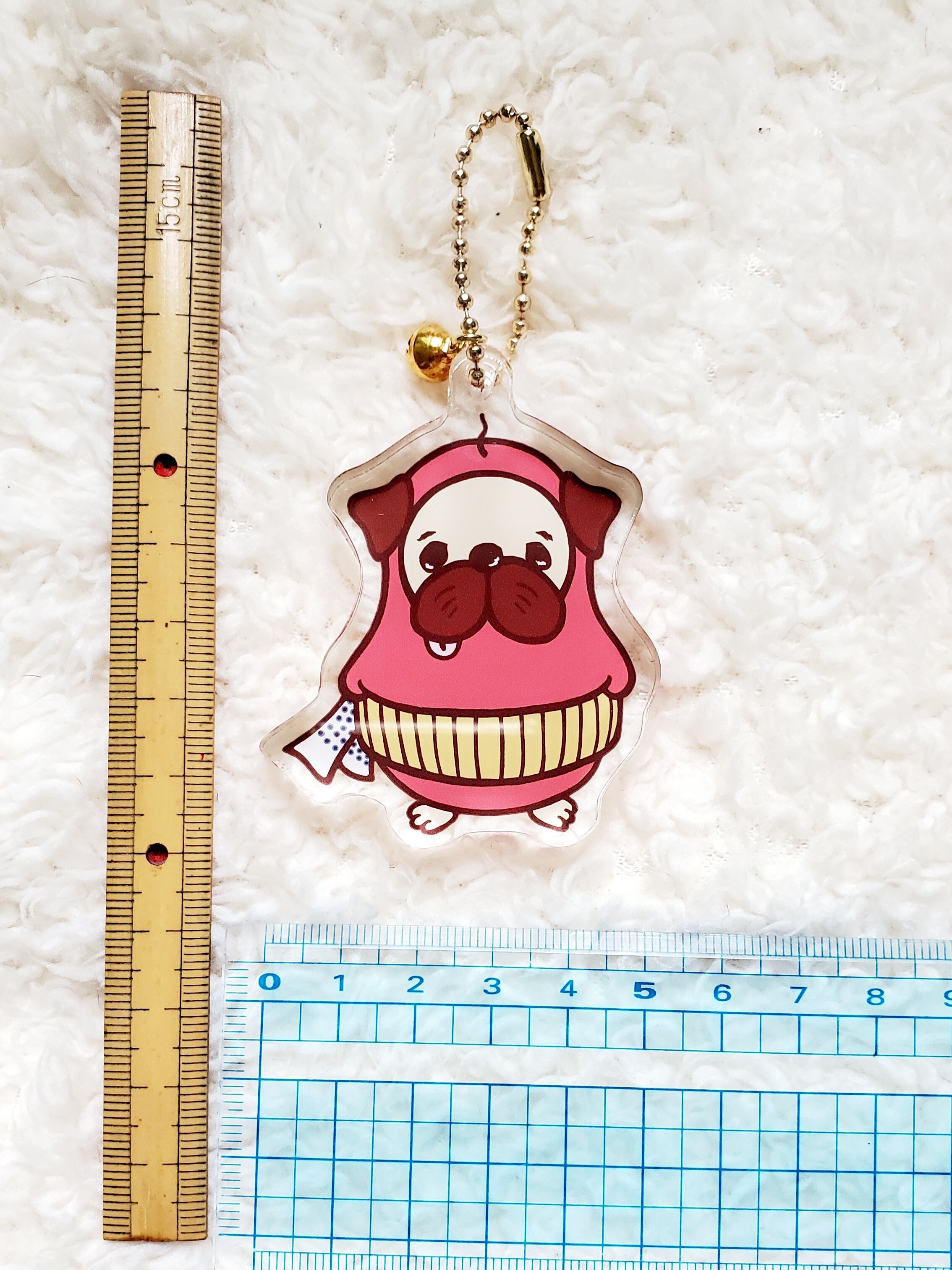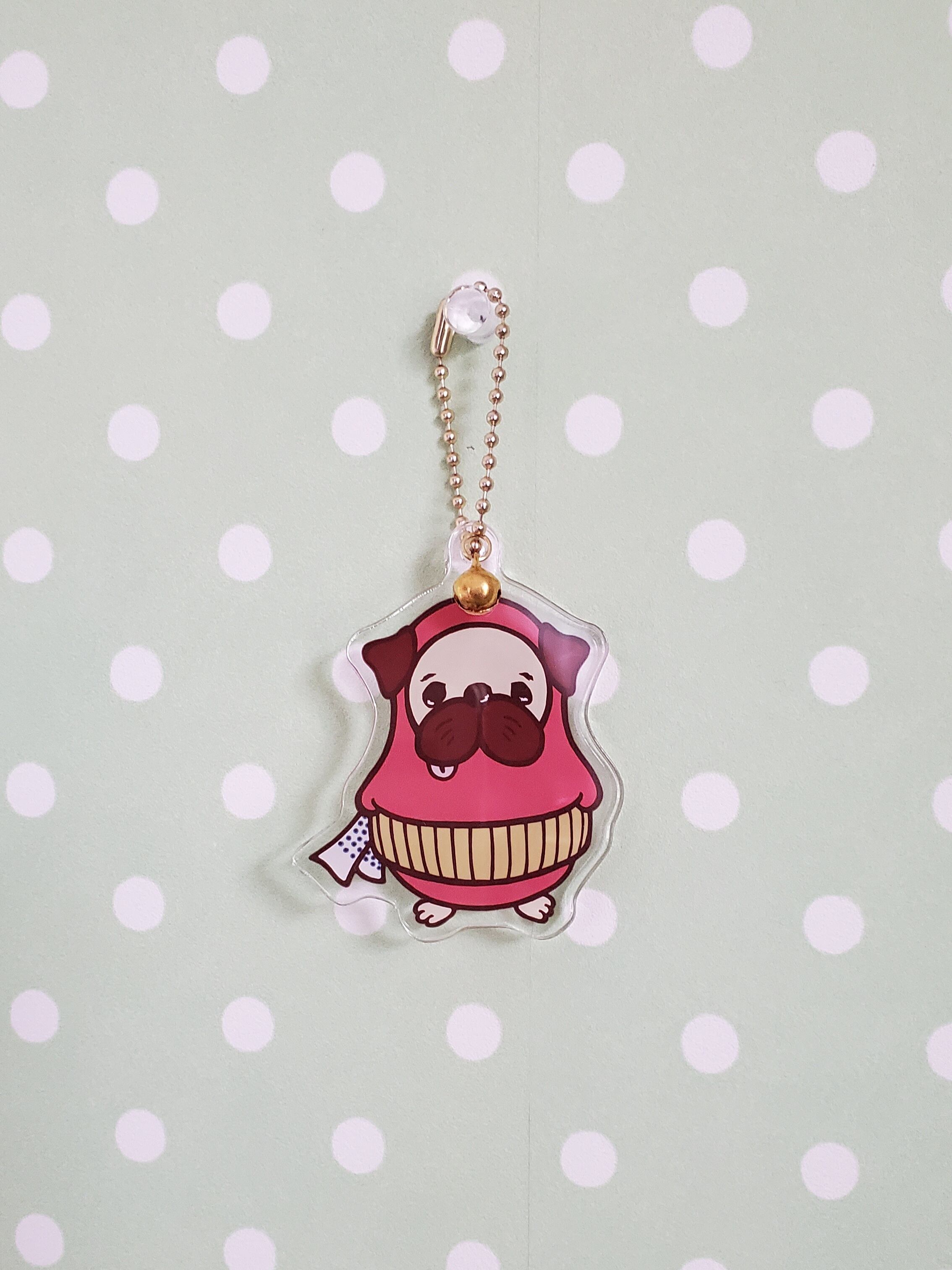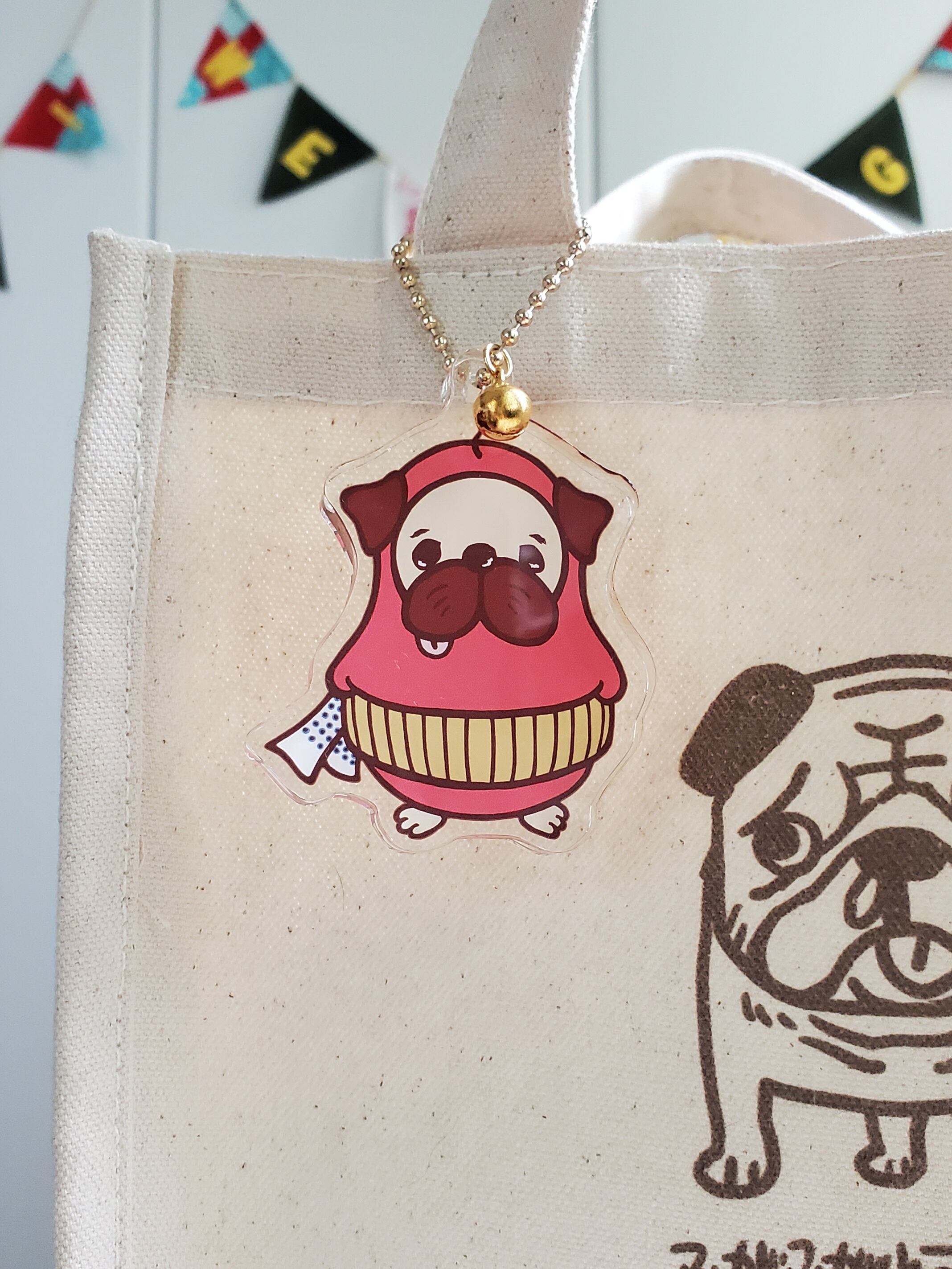 # 笑顔を運ぶ腹巻きパグのキーホルダー